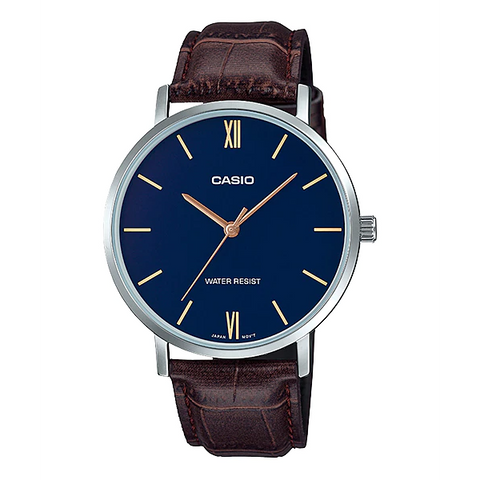 Casio Brown Leather Strap Blue Dial Quartz Watch for Gents - MTP-VT01L-2BUDF