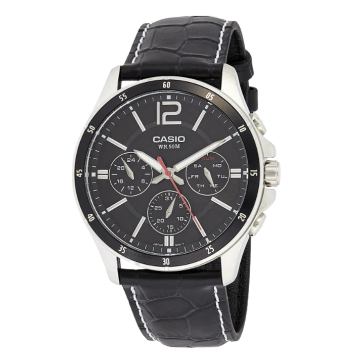 Casio Enticer Black Leather Strap Black Dial Chronograph Quartz Watch for Gents - MTP-1374L-1AVDF