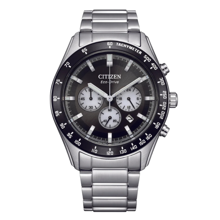 Citizen Eco-Drive Silver Stainless Steel Black Dial Chronograph Quartz Watch for Gents - CA4674-58E