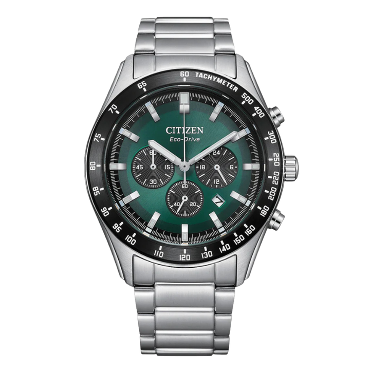 Citizen Eco-Drive Silver Stainless Steel Green Dial Chronograph Quartz Watch for Gents - CA4674-58X