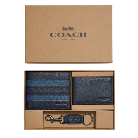 This Coach Compact 3-in-1 Wallet Set features a stylish V-stripe design.