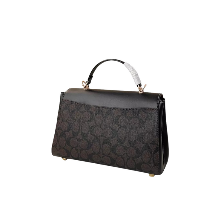 The Coach Small Georgie Top Handle bag in Blocked Signature Canvas blends elegance with everyday functionality. Featuring a sleek black and brown leather design, it offers a structured silhouette, top handle, and detachable strap for versatile styling. Perfect for both casual and formal looks.