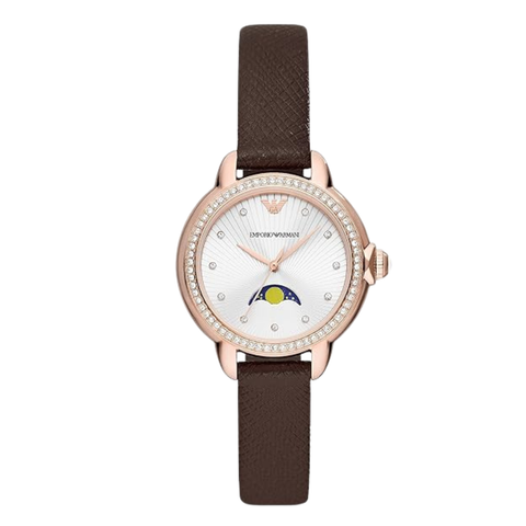 Emporio Armani Moonphase Brown Leather Strap Silver Dial Quartz Watch for Ladies - AR11568