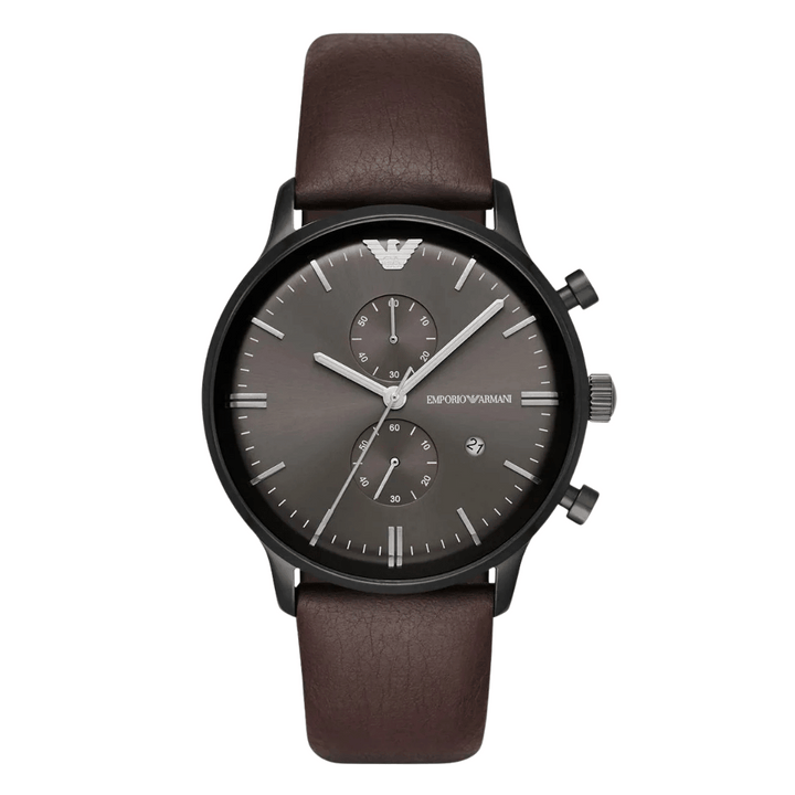 EMPORIO ARMANI Retro Brown Leather Strap Gunmetal Dial Chronograph Quartz Watch for Gents - AR1932