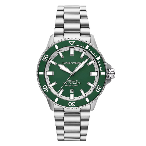 Emporio Armani Tazio Silver Stainless Steel Bracelet Green Quartz Watch for Men – 42 mm (AR6088)