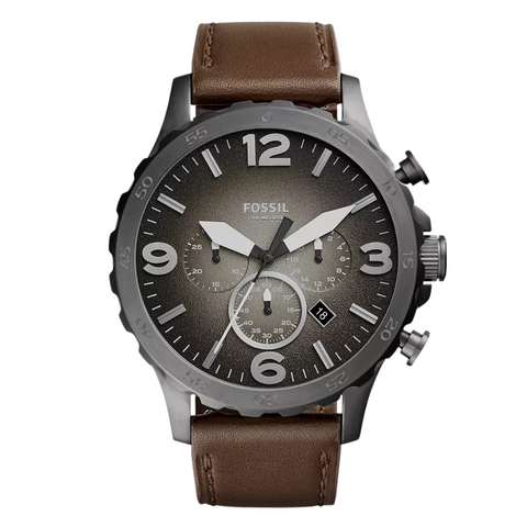 Fossil Nate Brown Leather Strap Grey Dial Chronograph Quartz Watch for Gents - JR1424