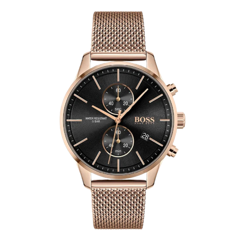 HUGO BOSS Associate Rose Gold Mesh Bracelet Black Dial Chronograph Quartz Watch for Gents - HUGO BOSS 1513806