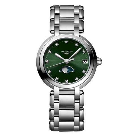 Longines PrimaLuna Moonphase Silver Stainless Steel Green Dial Quartz Watch for Ladies - L8.115.4.67.6