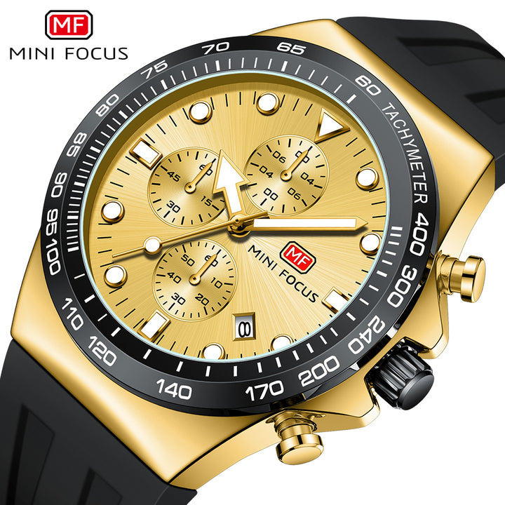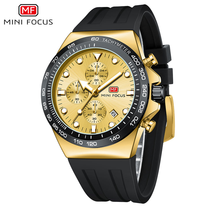 Mini Focus Black Silicone Strap Gold Dial Chronograph Quartz Watch for Gents - MF0488G-04
