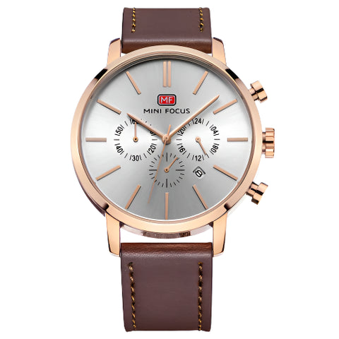 Mini Focus Brown Leather Strap Silver Dial Chronograph Quartz Watch for Gents - MF0023G-03