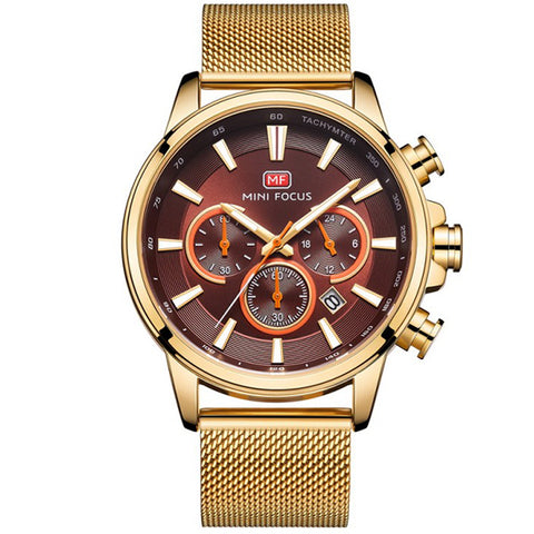 Add to WishlistMini Focus Gold Mesh Bracelet Maroon Dial Chronograph Quartz Watch for Gents - MF0142G-03