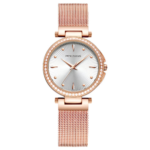 Mini Focus Rose Gold Mesh Bracelet Silver Dial Quartz Watch for Ladies - MF0194L-04