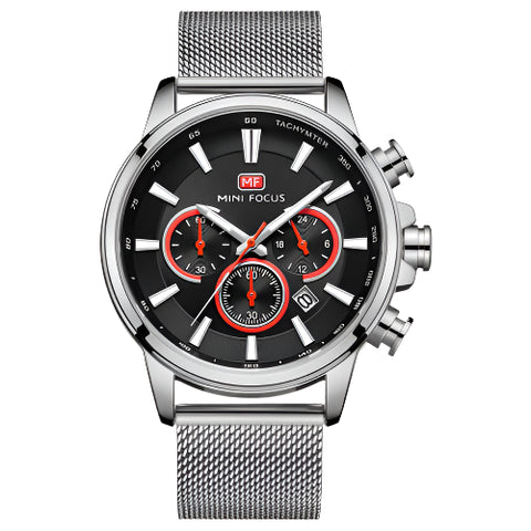 Mini Focus Silver Mesh Bracelet Black Dial Chronograph Quartz Watch for Gents - MF0142G-01