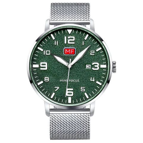 Mini Focus Silver Mesh Bracelet Green Dial Quartz Watch for Gents - MF0158G-07