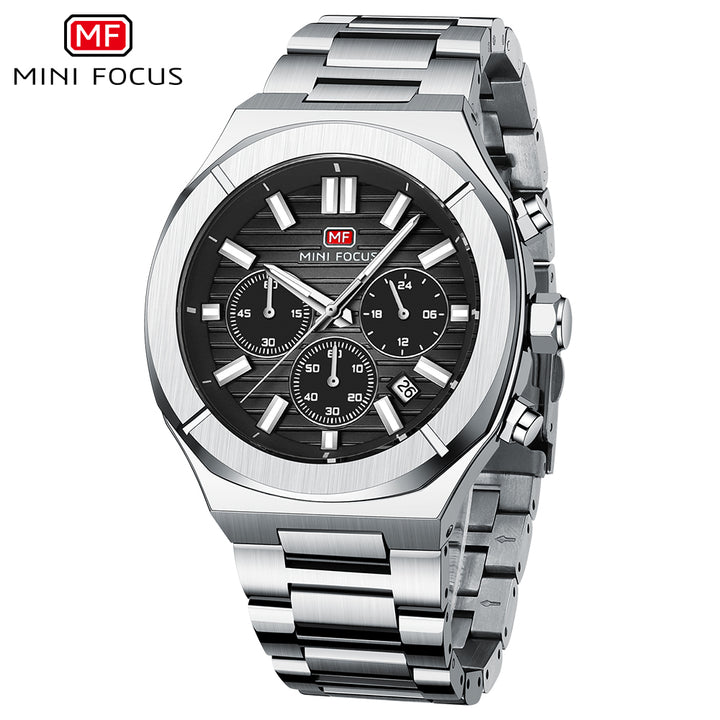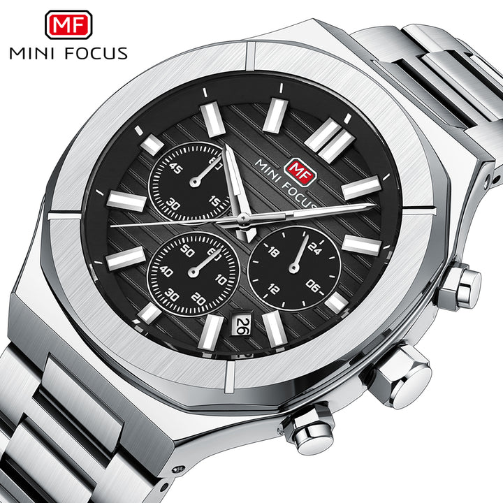 Mini Focus Silver Stainless Steel Black Dial Chronograph Quartz Watch for Gents - MF0612G-01