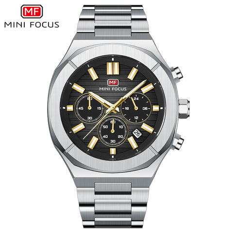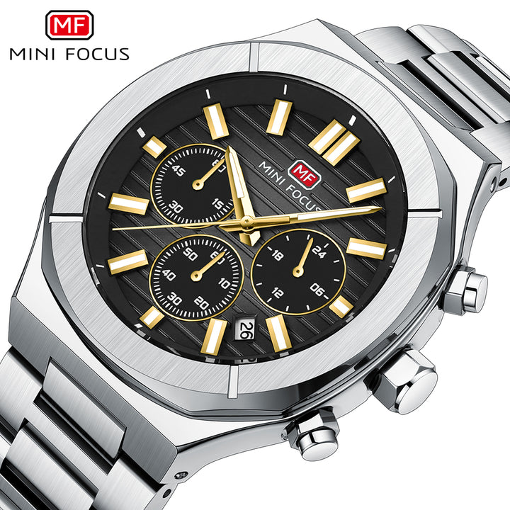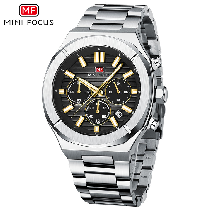 Mini Focus Silver Stainless Steel Black Dial Chronograph Quartz Watch for Gents - MF0612G-04