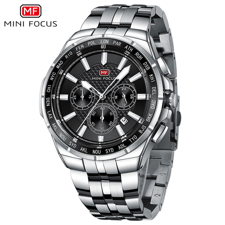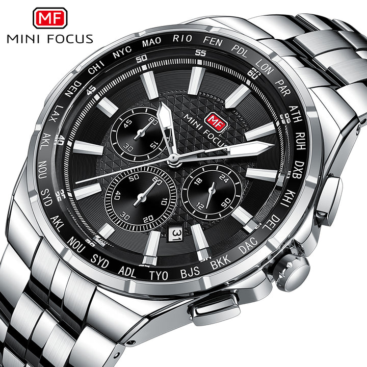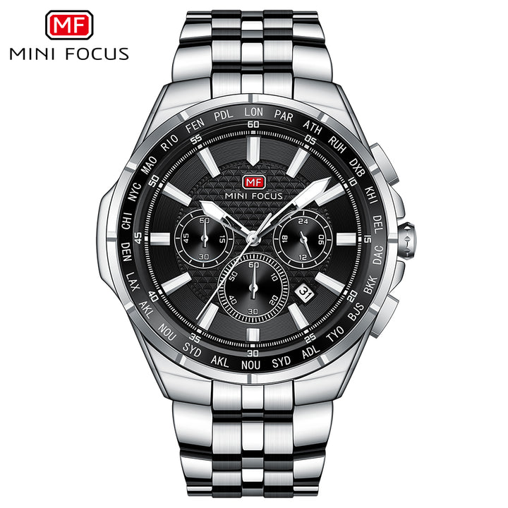 Mini Focus Silver Stainless Steel Black Dial Chronograph Quartz Watch for Gents - MF0613G-01