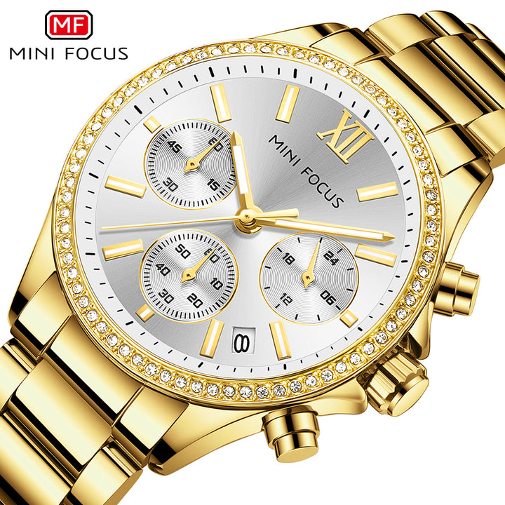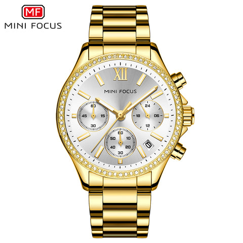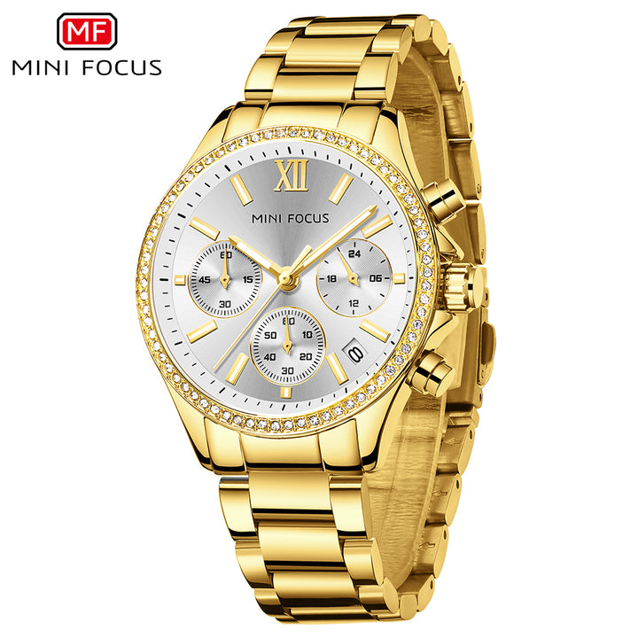 Mini Focus Silver Stainless Steel Gold Dial Chronograph Quartz Watch for Ladies - MF0617L-04