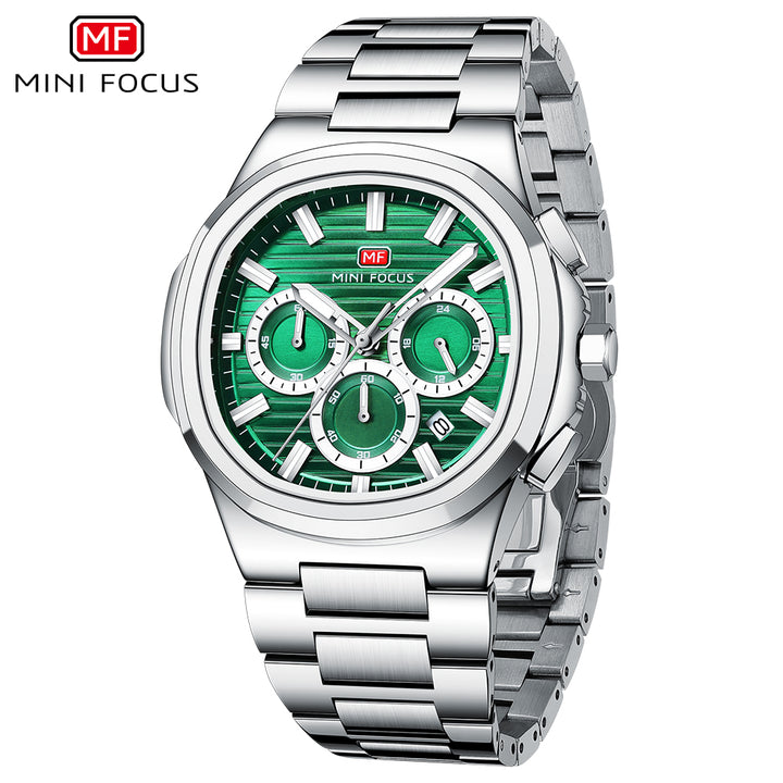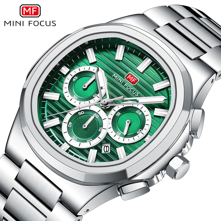 Mini Focus Silver Stainless Steel Green Dial Chronograph Quartz Watch for Gents - MF0610G-03