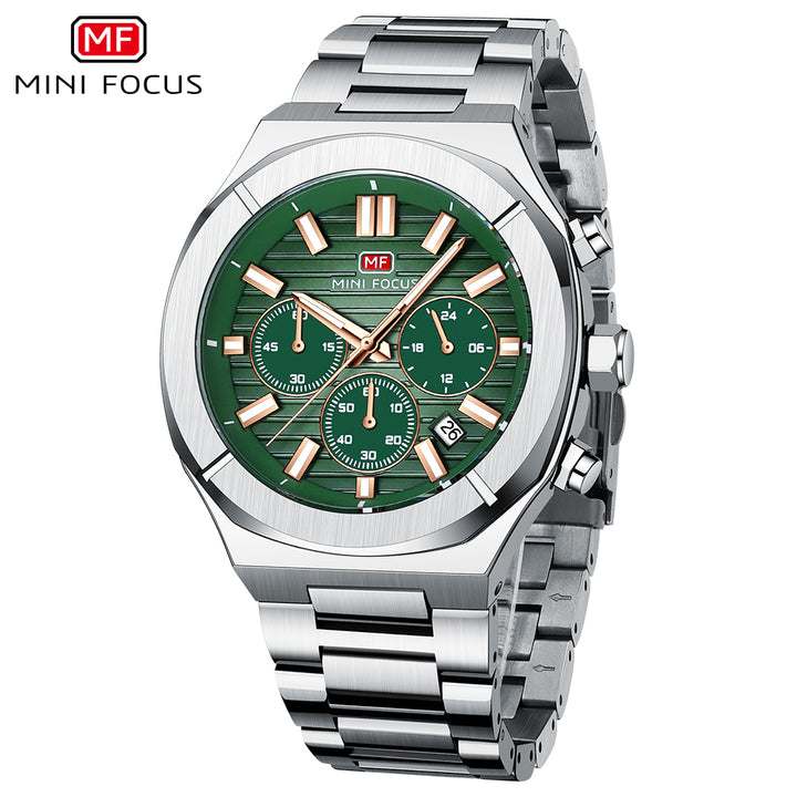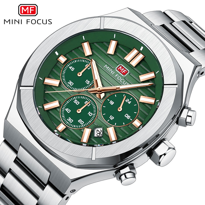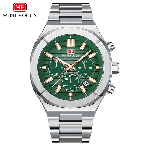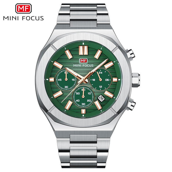 Mini Focus Silver Stainless Steel Green Dial Chronograph Quartz Watch for Gents - MF0612G-03