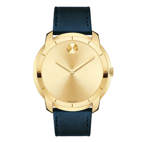 Movado Bold 3600469 – Gold-Tone Sunray Dial with Navy Leather Strap Men's Watch