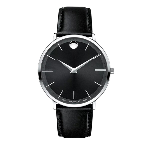 Movado Ultra Slim Black Leather Strap Black Dial Quartz Watch for Gents - Movado 0607086