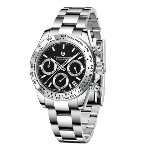 Pagani Silver Stainless Steel Black Dial Chronograph Quartz Watch for Gents - PD-1727
