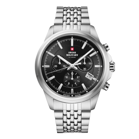 Swiss Military Silver Stainless Steel Black Dial Chronograph Quartz Watch for Gents - SM34107.01