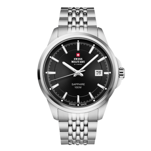 Swiss Military Silver Stainless Steel Black Dial Quartz Watch for Gents - SM34104.01