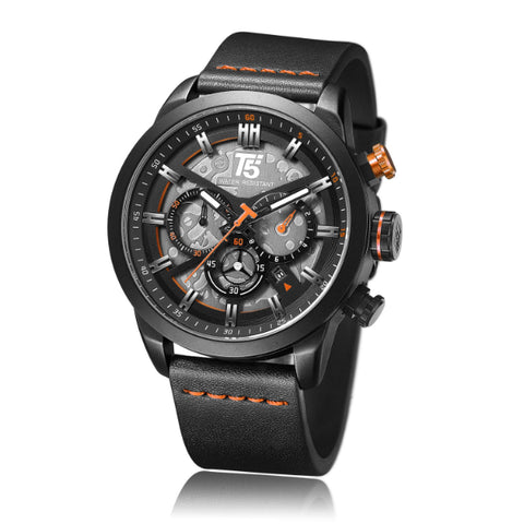T5 Black Leather Strap Grey Dial Chronograph Quartz Watch for Gents - H3625G-B