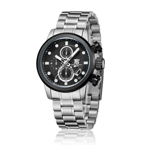 T5 Silver Stainless Steel Black Dial Chronograph Quartz Watch for Gents - H3587G-C