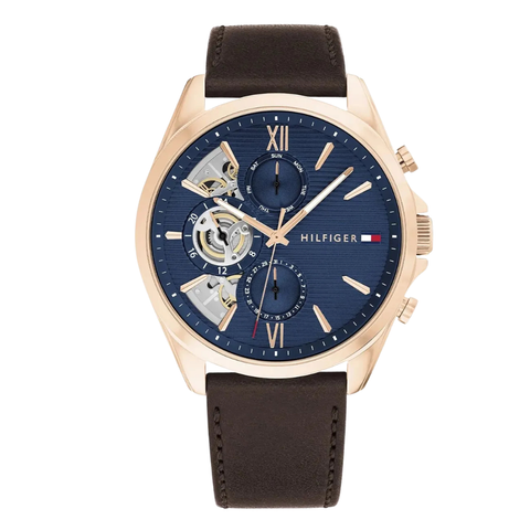 Tommy Hilfiger Brown Leather Strap Blue Dial Chronograph Automatic Watch for Gents - Tommy Hilfiger 1710645