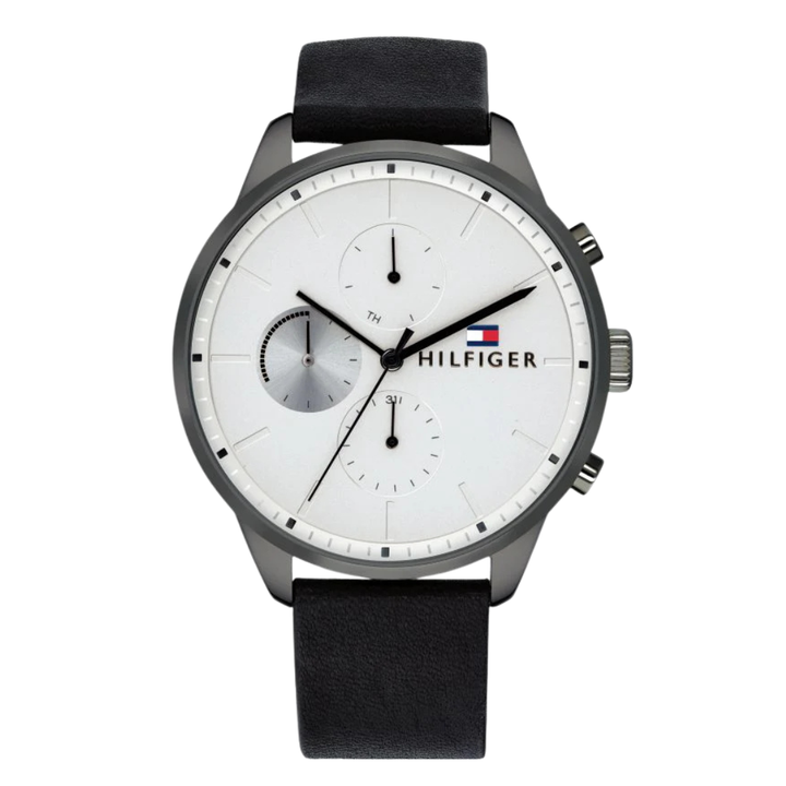 Add to WishlistTommy Hilfiger Chase Black Leather Strap White Dial Chronograph Quartz Watch for Gents - 1791489