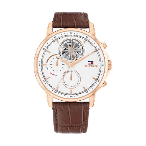 Add to WishlistTommy Hilfiger Stewart Brown Leather Strap White Dial Chronograph Quartz Watch for Gents - 1710606